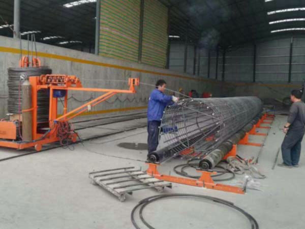 3、機(jī)器上骨架制作過(guò)程;備齊一節(jié)鋼筋籠所需箍筋按位置平放兩輥輪上,將一根主筋抬放于輥輪長(zhǎng)度上方,調(diào)整好起始尺寸,豎直箍筋,主筋靠著箍筋單面施焊,待主筋轉(zhuǎn)至上方再補(bǔ)焊。焊完一節(jié)主、箍筋,低速轉(zhuǎn)動(dòng)膠輥,抬二根主筋準(zhǔn)備焊接。此時(shí)按選定生產(chǎn)工藝確定旋轉(zhuǎn)方向,采用卡具(比子)制作骨架時(shí),待二根主筋或多根主筋焊完后,主筋下行。若采用掛鉤工藝則反向旋轉(zhuǎn),應(yīng)注意多根主筋焊好后有可能出現(xiàn)偏重,可將骨架旋轉(zhuǎn)在對(duì)面位置或錯(cuò)開(kāi)幾根位置后再開(kāi)始分度焊接,后補(bǔ)齊焊完全部主筋。
